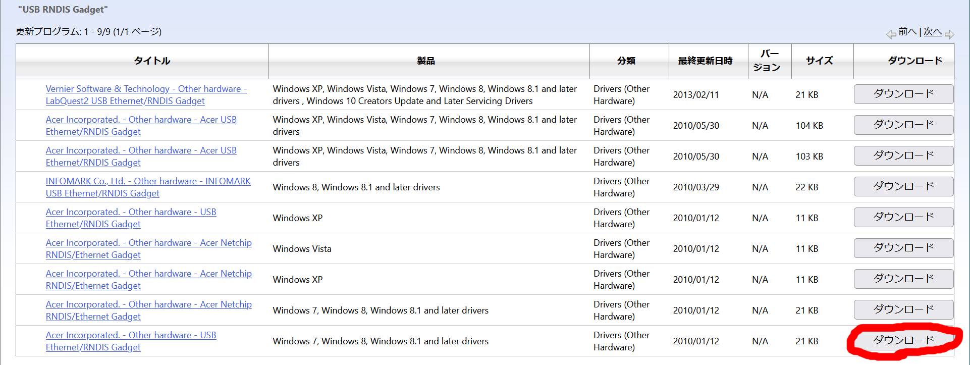 まず下記のページから「Acer Incorporated. - Other hardware - USB Ethernet/RNDIS Gadget」の「Windows 7, Windows 8, Windows 8.1 and later drivers」版をダウンロードします。
