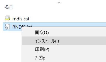 すると「mdis.cat」「RNDIS.inf」ファイルが出てくるので「RNDIS.inf」ファイルを右クリックして「インストール」を選びます。そうすればインストールできます。
