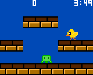 | スティックの左右で移動してボタンでジャンプする。ひよこはジャンプして上から蹴ってやっつける。横、下から当たるとやられる。 | |