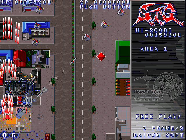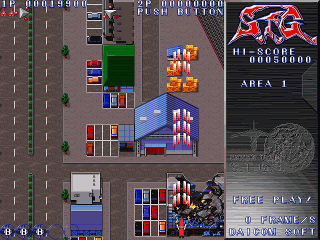 S.T.G.のSTAGE 1は石川県金沢市桜田町がモチーフになっています。S.T.G.を作り始めた頃は桜田町にあるI-O DATAって会社に勤めていたので第1ビル、第2ビル両方ゲーム中にも出てきます。看板がI-O ATA、I-O DAAになっているのは本当にネオンが切れてそうなっていた時期があったからです(笑)ゲーム中では石川県の国道8号線「示野中交差点」からカジマート桜田店方向に向かってまっすぐ犀川の横の道沿いに進んで若宮大橋辺りで雲の上に飛び立ちボスと戦います。あれから20年たった2018年にGoogleMapを見てみると当時あったケーズデンキや王様の本、8番らーめん、ローソンは無くなってしまっているのですね・・・。