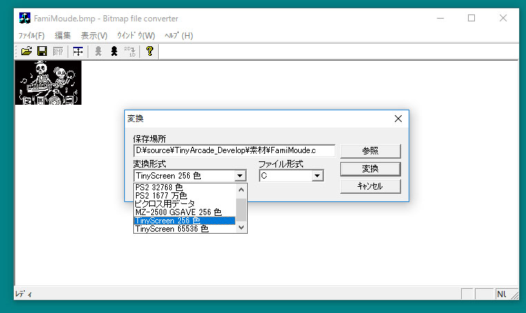 (1)「ファイル」-「開く」を選びpngまたはbmpファイルを読み込む。 (2)「ファイル」-「変換」を選び変換ダイアログを表示する。 (3)「変換形式」「ファイル形式」を選び「変換」ボタンを押す。 変換形式は「TinyScreen 256 色」か「TinyScreen 65536 色」を選びファイル形式は「C」を選ぶ。