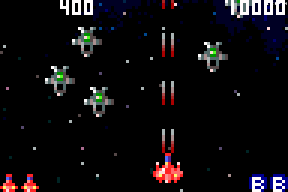| タイトル画面でスティックの左右で難易度選択してボタンを押したらゲームスタート。左上がスコア、右上がハイスコア、左下が残機、右下がボンバー残り数。 | |